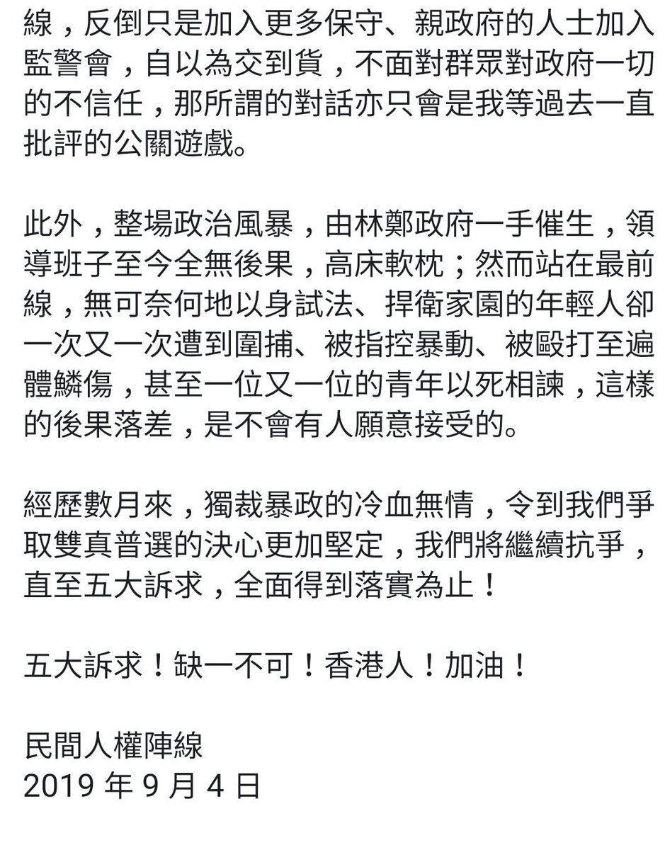 民陣回應林鄭撤案: 獨裁暴政,冷血無情 五大訴求,缺一不可!